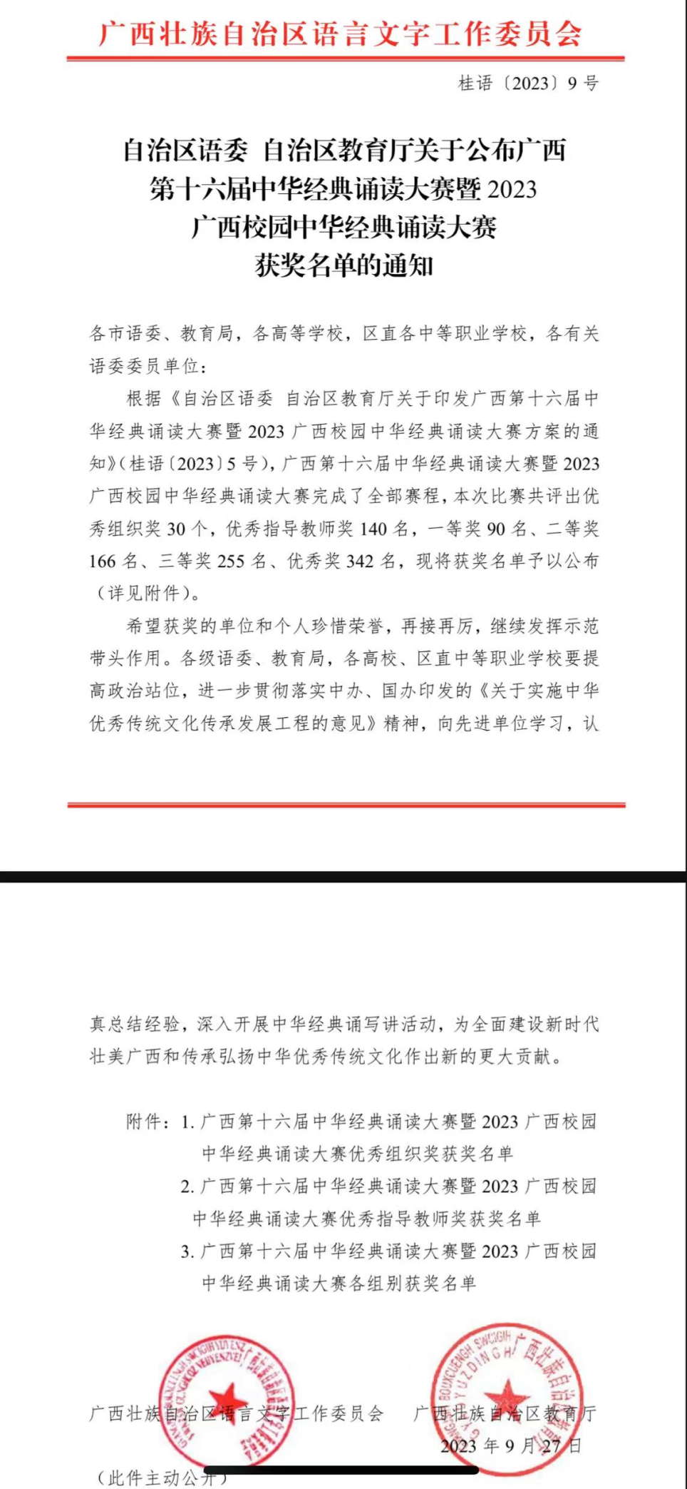 广西第十六届中华经典诵读大赛暨2023广西校园中华经典诵读大赛于今年7月圆满结束。自2008年举办首届大赛以来,广西中华经典诵读大赛已连续举办十六届,每年参加活动人数超过100万人次。