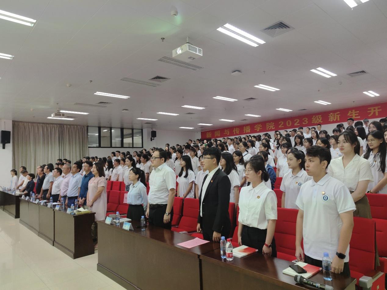 典礼开场,本科生新生代表播音与主持专业播音231班吴英娇发言,她表示,她的新闻理想是让无力者有力,为无声者发声,通过流畅而有力的语言,争做优秀新闻工作者,传递正能量,并希望能够在老员工活中不断探索、不断体验,用不怕输的自信与勇气去迎接每一个新挑战,释放青春热血。