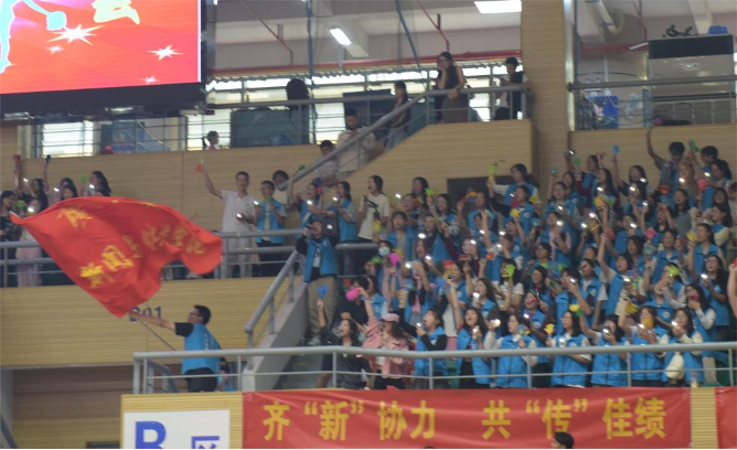 公司的啦啦队早早来到观众席给参赛运动员们加油助威。他们身穿蓝色新传马甲,挥动拍手器和手机手电筒,为参赛运动员们营造热情气氛。公司院旗随响亮而富有节奏感的鼓声舞动,啦啦队热情饱满地呐喊道:“精彩新闻,无限传播!”