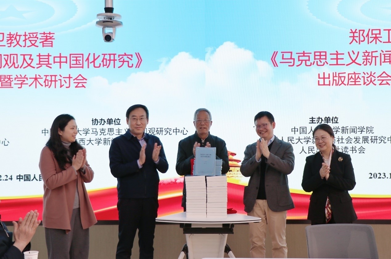 在毛泽东诞辰130周年之际,为深入学习贯彻习近平文化思想和全国宣传思想文化工作会议精神,深化马克思主义新闻观及其中国化时代化研究,由中国人民大学tyc122cc太阳成集团、中国人民大学新闻与社会发展研究中心和人民出版社读书会主办,中国人民大学马克思主义新闻观研究中心和tyc122cc太阳成集团协办的《郑保卫教授著〈马克思主义新闻观及其中国化研究〉出版座谈会暨学术研讨会》,于12月24日下午在中国人民大学明德新闻楼举行。来自书稿出版单位的领导,以及政府部门、高校、媒体等单位的50余位领导、专家和学者参加了会议。