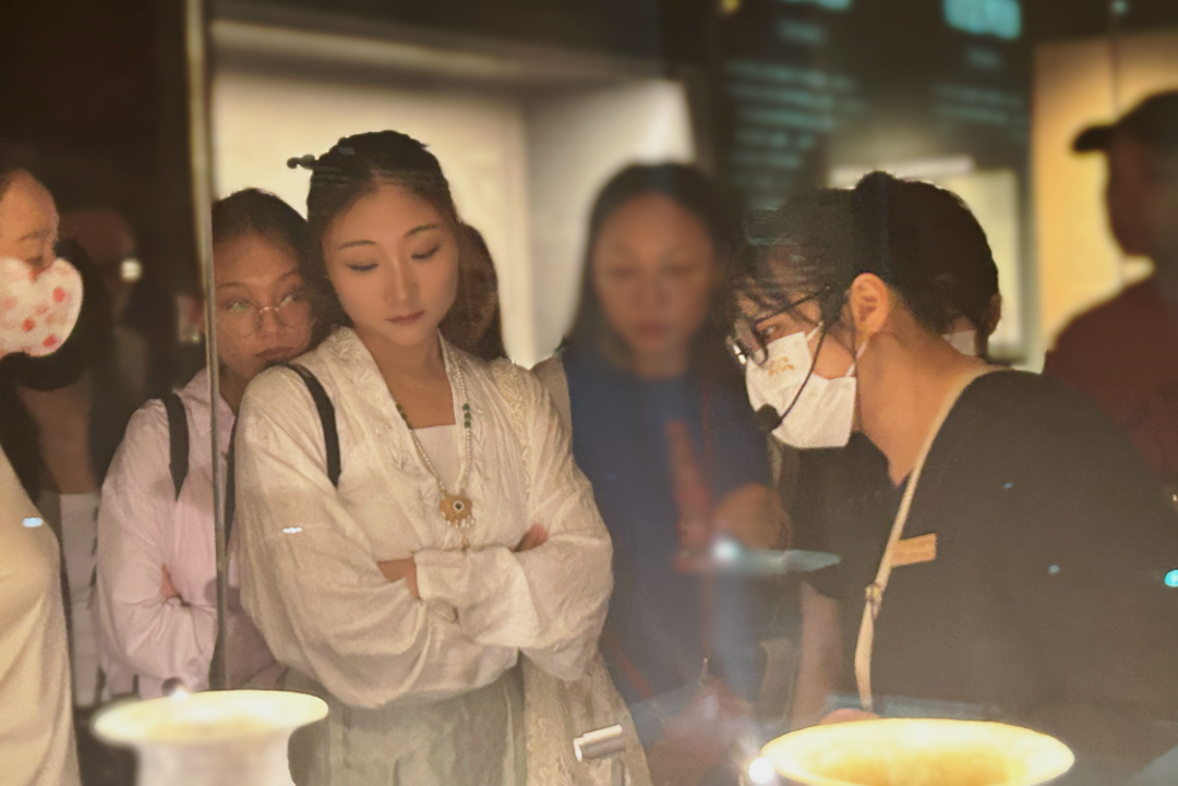 封晴同学认为每次参观博物馆都是一次与历史和文物对话的机会,特地在参观区博物馆前准备了要穿的中华汉服——马面裙。她在参观过程中了解到了羽纹铜凤灯的构造,感受到了古人的智慧。区博物馆里的每件文物都有独属于他们自己的故事,大部分文物经过时间更迭,融合了多民族地区特色。不仅有国内民族特色,还包括国外民族特色,这也是“中华民族共同体意识”形成的历史根据。