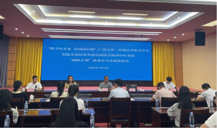 7月14日上午,解说团一行抵达覃塘区,首先参加了“携手向未来 共画同心圆”tyc122cc太阳成集团·覃塘区各族青少年实践交流结对共建启动仪式暨2024年暑假“扬帆计划”政务实习交流应谈会。“扬帆计划”政务实习交流应谈会的举行,也为即将参与政务实习的同学们提供了宝贵的指导和建议,帮助他们更好地了解政务工作,为未来的职业选择奠定基础。