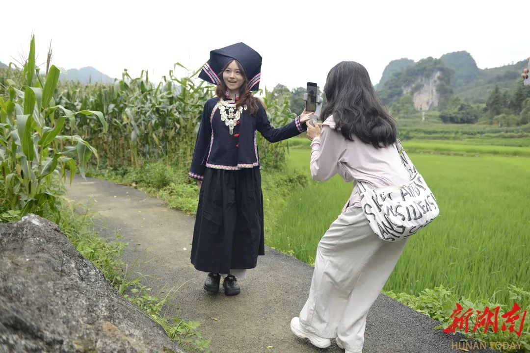 边境的文化基因,藏在博物馆的文物里,也活在非遗传承人的指尖上。在那坡,广西边疆民族博物馆的铜鼓纹路诉说着壮乡千年史,彝族生态博物馆里“跳弓节”影像,男女老幼牵手绕金竹欢舞的场景,让同学们读懂节日里的民族向心力。尼的呀田园综合体中,师生一行感受黑衣壮的服饰纹样与饮食起居情况,一幢幢干栏式建筑旁,农文旅融合的乡村振兴图景跃然眼前。此外,同学们还以田园为幕、青山作景,借短视频向传统经典刘三姐隔空致敬。