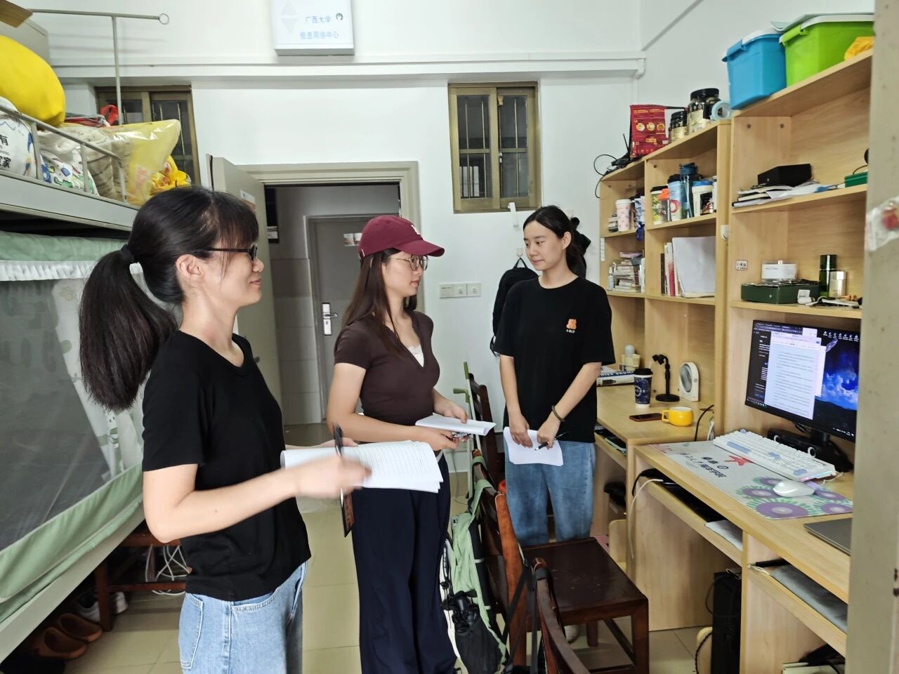 检查人员逐间入内查看,既关注地面清洁度、桌面物品摆放、床铺整理等基础内务,也重点检查垃圾清运、阳台卫生,同时排查通风是否及时、防蚊措施是否到位、有无安全隐患等细节。对发现的问题,辅导员当场向宿舍成员反馈,员工干部同步做好记录,清晰明确整改方向。
