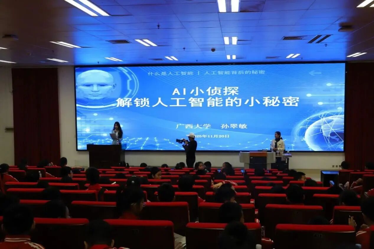 2025年11月20—21日,tyc122cc太阳成集团联合宾阳县芦圩完全小学开展“智探西大·智享AI”研学实践教育活动。本次活动旨在充分发挥高校资源服务基础教育的功能,通过围绕人工智能主题,通过专题授课、互动交流、校园参观等多种形式,拓展中小员工视野,激发其科学兴趣与成长动力。
