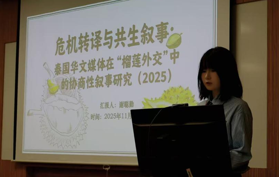在李凯副教授指导下,硕士研究生谢聪勤在“华文媒体与区域发展”分论坛上(专题为“东南亚华文传媒”),以《危机转译与共生叙事:泰国华文媒体在“榴莲外交”中的协商性叙事研究(2025)》为题作报告。她在报告中以2025年泰国榴莲危机为例,聚焦技术标准冲突、制度信任崩塌及市场流通梗阻三重困境,主要探讨以泰国头条社为代表的泰国华文媒体的协商性叙事策略。泰国头条社以多模态叙事矩阵为依托,借助三角叙事联盟和感官共同体构建,实现技术争议祛魅化的三重转译。报告提出“协商性叙事”新范式,拓展了危机传播中的跨文化信任机制,同时批判数字鸿沟下的权力失衡等隐患,呼吁通过建立中泰联合检测实验室等举措实现从符号共生到制度共建的跨越。