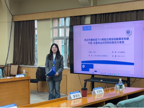 在张剑副教授指导下,2024级硕士研究生周雨欣在平行论坛一中以《媒介可供性视域下人工智能赋能广西—东盟传播的创新实践研究》为题作分享报告。在人工智能技术深刻影响国际传播的背景下,她聚焦广西面向东盟的相关传播实践,探讨如何以人工智能积极应对跨境传播中的文化折扣、单向输出与技术不平等困境。研究以媒介可供性理论作为核心分析框架,探索人工智能如何为内容生产、跨文化互动、跨境场景传播与跨国协同合作提供新型行动路径,最终为构建具有韧性、包容性与创新性的中国—东盟智能传播共同体贡献效能。