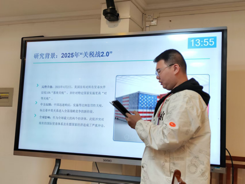 在汪苑菁副教授的指导下,硕士研究生林喆鸿在平行论坛一上作题为《东南亚华文媒体针对中美关税战的报道策略分析——基于新加坡<联合早报>2025年相关报道的批判性话语分析》的报告。研究聚焦2025年“关税战2.0”背景下,新加坡华文媒体《联合早报》如何构建中美冲突叙事,采用费尔克拉夫三维话语分析模型对核心报道文本进行剖析。研究发现,《联合早报》的报道构建了清晰的“施暴者(美国)—抗争者(中国)”二元对立叙事框架。研究强调,这一叙事策略并非简单基于情感或固有“亲华”立场,而是新加坡基于自身国家利益的理性选择。媒体通过同情中国并批判美国单边行为,巧妙地与新加坡政府的官方立场保持高度一致,其本质是通过支持中国扮演的“秩序维护者”角色,间接维护新加坡自身的生存之本。
