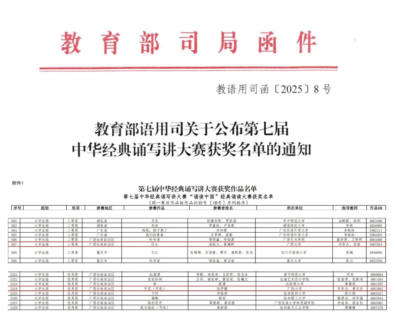 近日,由教育部、国家语言文字工作委员会(简称国家语委)主办的第七届中华经典诵写讲大赛获奖名单正式公布。在老师的悉心指导下,公司学子在“诵读中国”经典诵读赛道中,斩获老员工组二等奖、优秀奖各一项。