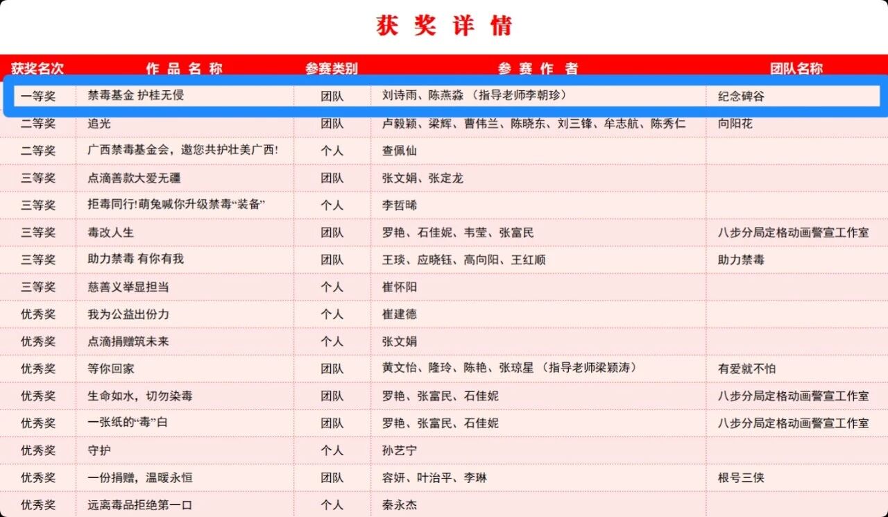 2月6日,广西禁毒基金会主办的禁毒宣传微视频征集活动评选结果揭晓,公司2025级专硕班刘诗雨、2024级专硕班陈燕淼合作创作的作品《禁毒基金 护桂无侵》从132部作品中脱颖而出,荣获一等奖。