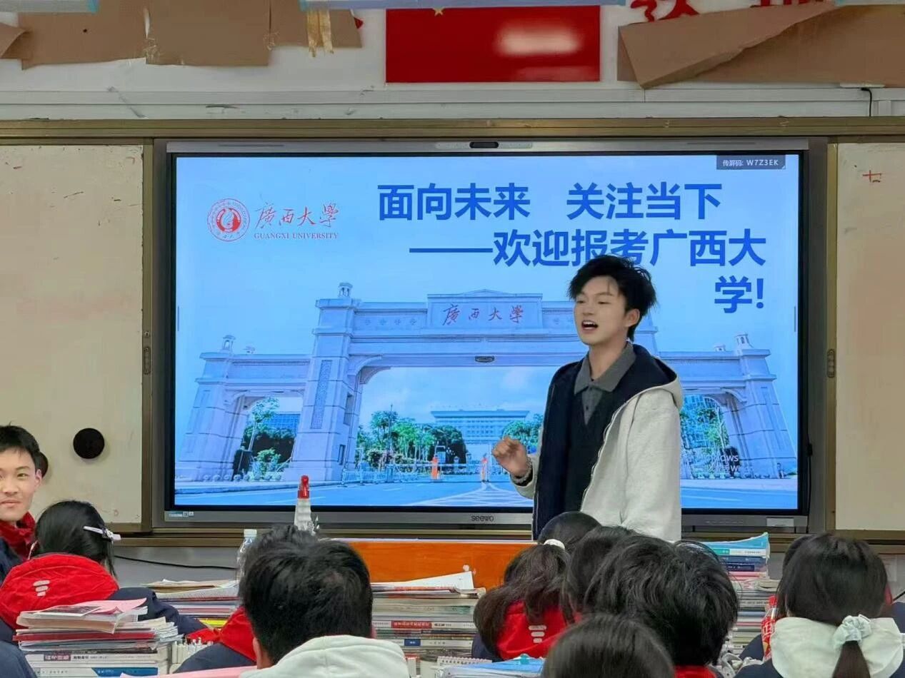情系母校,共赴山海。2026年2月5日,新闻251班的韦颖霞同学与越南语251班的邓潘子悦,一同重返母校南宁二中,面向500余名高三学子,开展了一场充满力量的宣讲分享。