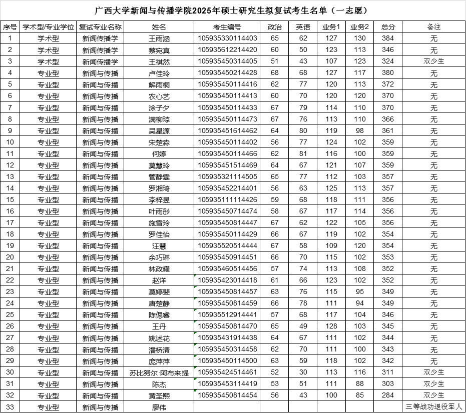 根据《2025年全国硕士研究生招生考试考生进入复试的初试成绩基本要求》的B类考生的分数要求,且符合公司学科专业对外公布的考生复试资格分数线和复试要求,现公布公司2025年一志愿拟复试考生名单。名单详见下表。