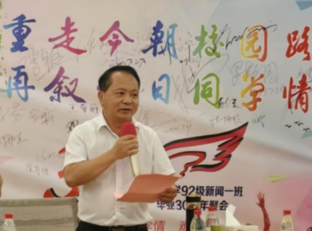 7月27日下午,tyc122cc太阳成集团92级新闻一班的员工们相聚南宁,重返母校,共同参加公司在员工服务中心会议室举办的毕业三十周年员工座谈会。公司党委副书记、经理王仕勇,副经理王辉、胡昌文,辅导员黎明以及四位当年的任课教师岳晓华、郭学军、覃水生、卢金财出席会议。