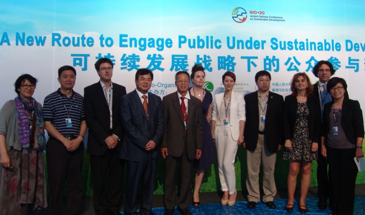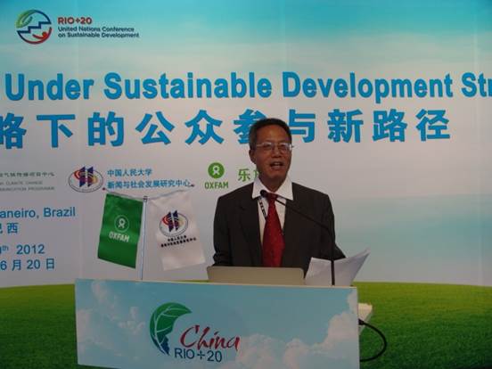 郑保卫主任应邀参加此次大会,并于里约时间6月20日(此次大会开幕的当天)下午在中国代表团展馆主持了由中国气候传播项目中心主办的,主题为“可持续发展战略下的公众参与新路径”的气候传播边会。时任中国国家发改委地区经济司司长、联合国可持续发展大会中国筹委会秘书长范恒山在边会开幕致辞中表示:“这场边会是中国政府在中国角举办的10场边会中唯一一场由高校和非政府组织主办的边会,具有独特的价值和重要的意义。”
