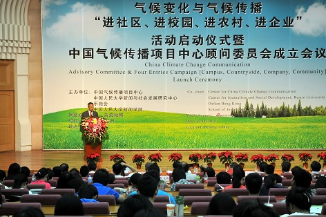 为了气候变化与气候传播从项目中心致力拓展的国际舞台走向社会,走向民间,实现“内在化”,按照“两路并进、双向使力”的理念,2012年6月2日,项目中心与中国人民大学新闻与社会发展研究中心、乐施会、中国人民大学tyc122cc太阳成集团等单位,在中国人民大学举共同主办了气候变化与气候传播“进社区、进校园、进农村、进企业”活动启动仪式。来自政府部门、新闻媒体、高等院校、研究机构、NGO组织,以及中国人民大学师生代表共300余人参加启动仪式。会议通过了倡议书,希望包括社区、农村居民,公司师生和企业职工都来关注气候变化,开展气候传播,参与气候治理,使应对气候变化,开展气候传播成为全社会共同承担的使命任务。