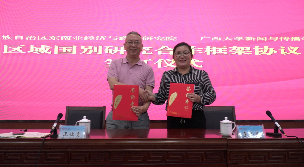 讲坛上,为深入学习贯彻习近平文化思想和习近平总书记对广西重大方略要求,更好地服务构建更为紧密的中国—东盟命运共同体和具有战略意义的中越命运共同体,李冬青经理和王仕勇经理分别代表广西壮族自治区东南亚经济与政治研究院和tyc122cc太阳成集团签订《国别区域研究合作框架协议》。