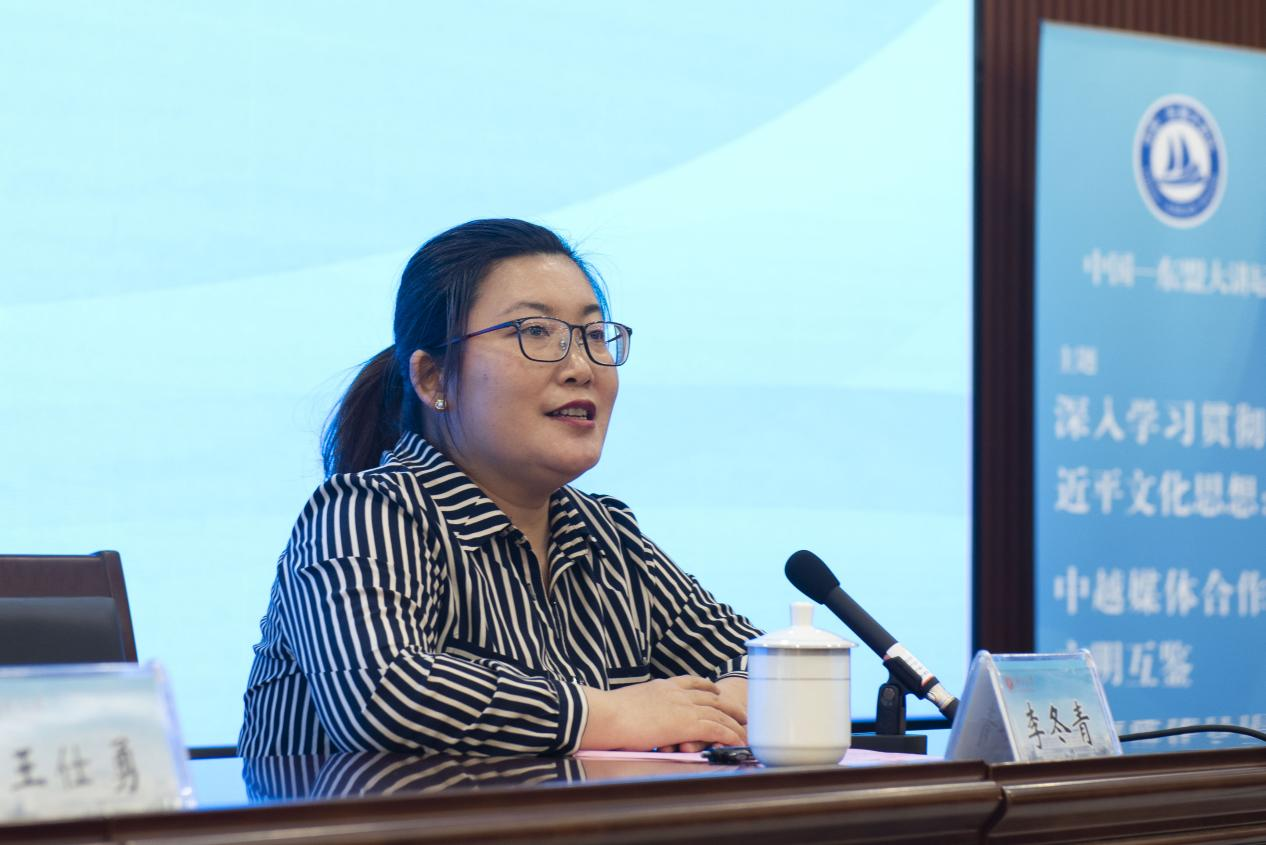 李冬青经理指出,当今各国命运紧密交织,不同文明交流互鉴对人类社会可持续发展、繁荣世界文明意义重大。党的十八大以来,习近平总书记倡导文明交流互鉴,提出全球文明倡议,为推动人类文明进步和应对全球共同挑战贡献中国智慧与激发精神力量。去年 12 月中越宣布构建具有战略意义的命运共同体。她强调,媒体是两国政府和人民间的桥梁纽带,在促进民心相通上至关重要,媒体人应深入研究如何宣传探讨中国和东盟各领域合作发展及增进民心相通。唐润华研究员的授课,将为我们深入学习贯彻习近平文化思想,理解文明互鉴与国际传播关系,更好地服务构建中国—东盟命运共同体及中越命运共同体带来思想启迪。