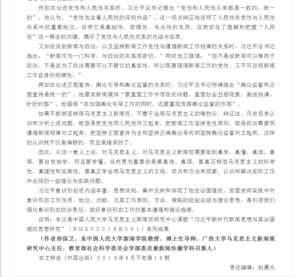 郑保卫经理在《中国出版》2018年8月下旬第16期发表了论文“论习近平意识形态观的核心与精髓”,这是中国人民大学马克思主义新闻观研究中心课题“习近平新时代新闻思想与其治国理政思想研究”(RMXY2018B001)系列成果。文章发表后,被人民出版社主办的中国理论网等主流网站转载,产生了较大影响。