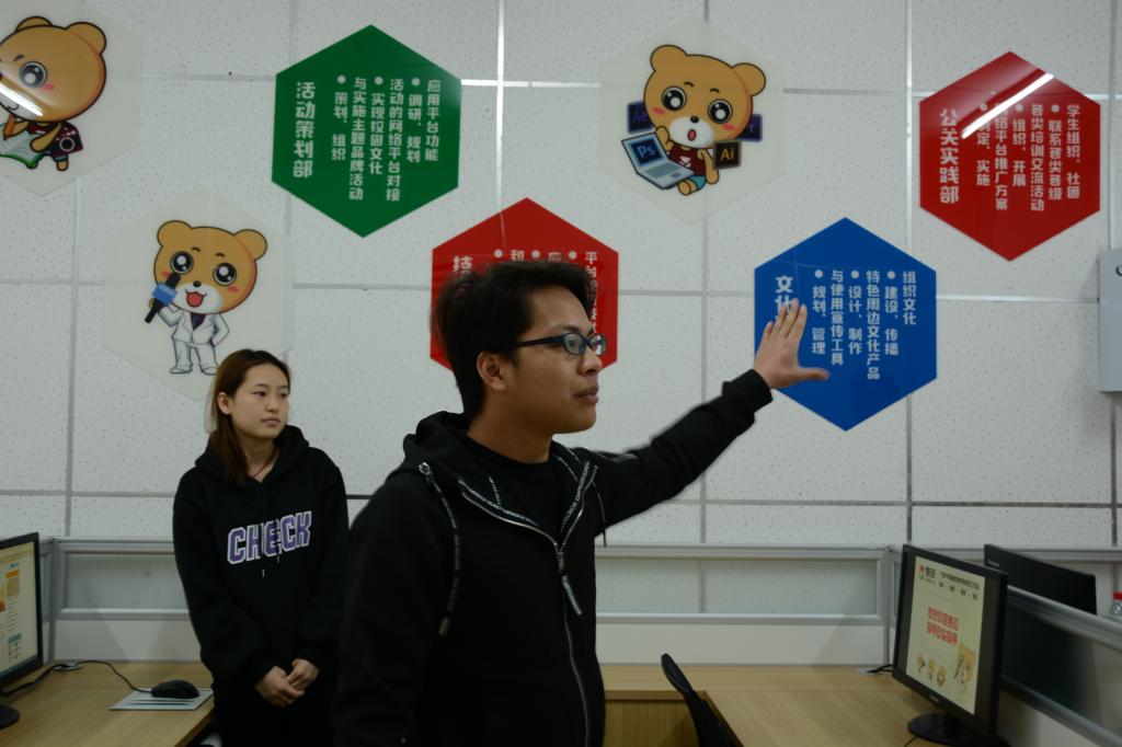 tyc122cc太阳成集团易班工作站站长覃玉富同学向来访嘉宾介绍了部门职能、文化建设、活动案例等方面,并展示了具有学科特色的周边文化产品,获得了李迎春副经理一行的充分肯定。