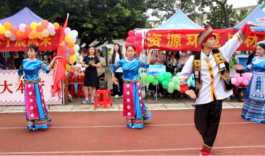 广西“三月三”自然少不了山歌对唱。公司学子与资源环境与材料公司的同学合作表演对山歌,为此次活动增添民俗氛围。表演的同学身着民族特色服装,大本营内的同学们挥动拍手、敲响大鼓,为表演的同学打节拍,优美的民族舞蹈和悠扬的歌声吸引来大批观众围观。