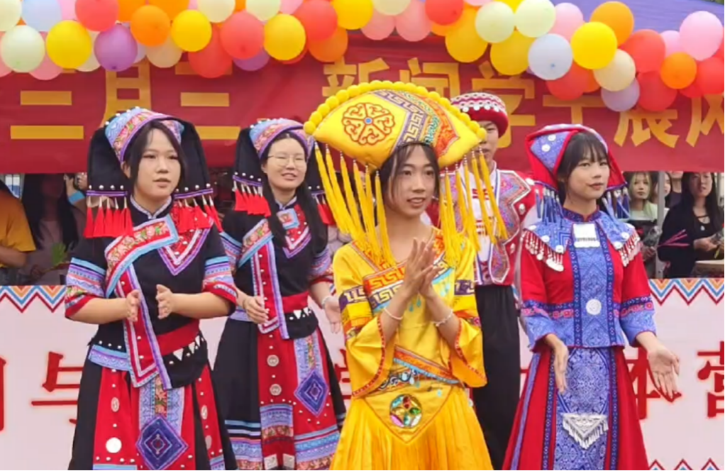 身着绚丽民族服饰的同学们,款步走秀,犹如一道道流动的风景线。壮锦色彩斑斓,服饰精美的绣花彰显着匠人的巧思。模特们步伐优雅,身姿挺拔,仿佛穿越时空,将古老的民族风情展现得淋漓尽致。