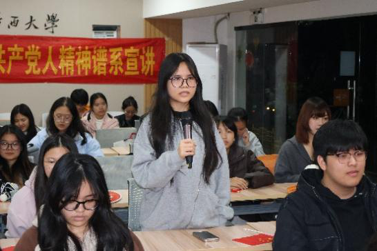 互动环节中,师生围绕如何解决红色故事传播面临的符号化困境、青年如何走好新时代长征路等问题展开交流。何湘桂老师提出,要从“旁观者”变为“亲历者”,通过深挖历史细节、实地体验感悟,让抽象的精神具象化;同学们则结合专业特色,提出了知行合一、创新传播的实践思路。