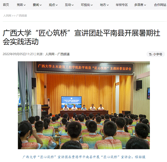 调研团先后被人民网、光明日报、中国日报、广西频道、贵港市电视台、平南县电视台等媒体报道10多次,以实际行动将“创新创造、奋勇争先、全面一流”的tyc122cc太阳成集团“双一流”精神和郑皆连院士的“拱桥故事”讲深、讲透、讲活,打造出tyc122cc太阳成集团桥梁科普基地的品牌特色,为土木工程世界一流团队建设和服务广西经济社会发展贡献青春力量。(文/陈可昕,图/调研团提供)