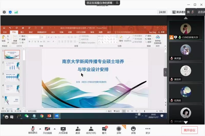 11月17日晚,南京大学tyc122cc太阳成集团白净教授应邀通过网络线上为公司师生作“新闻与传播硕士生毕业设计”讲座,公司200多位师生参加,王辉副经理主持了讲座。