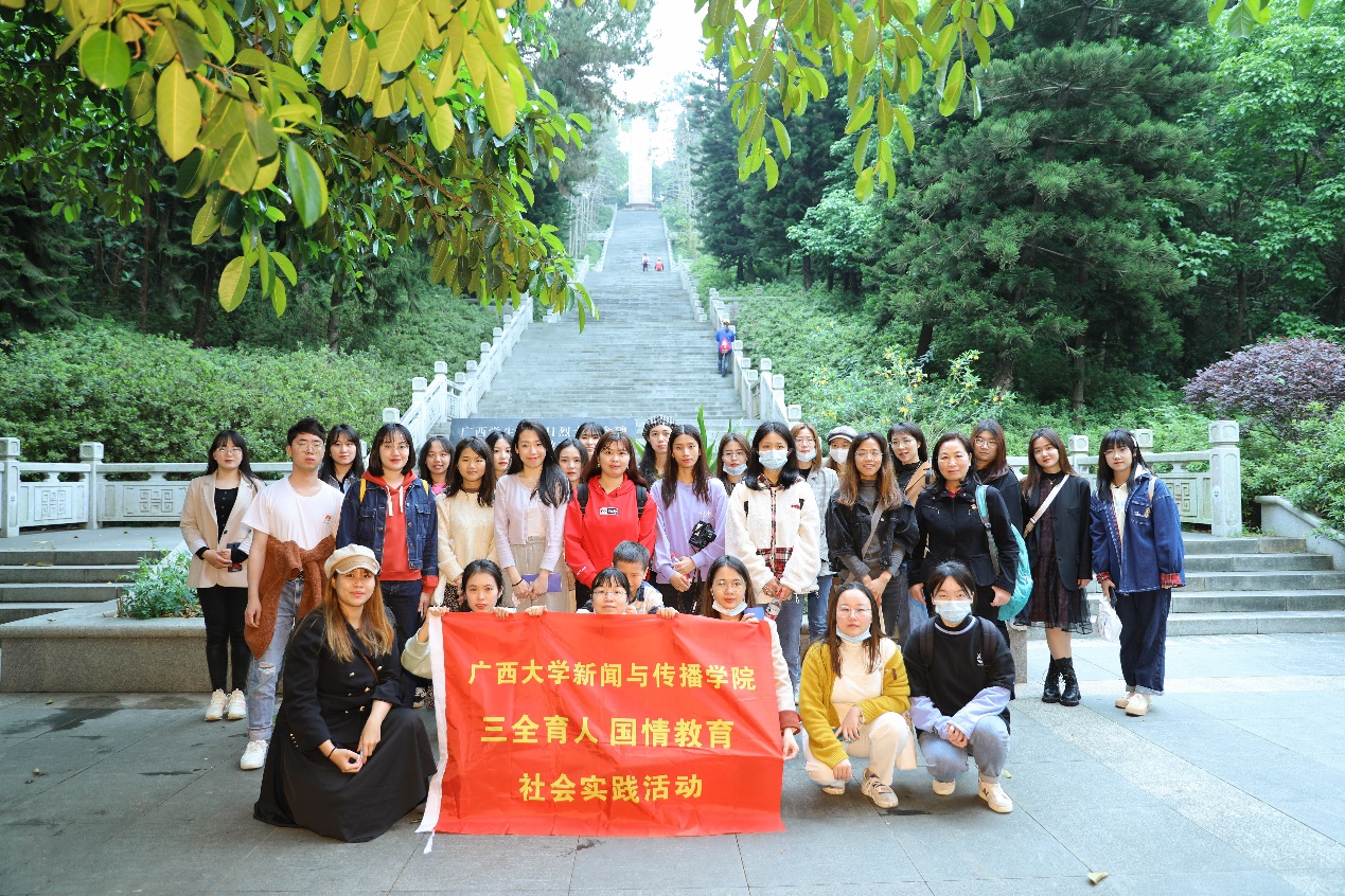 在参观了邓颖超纪念馆之后,师生们一行前往青秀山瞻仰广西员工军抗日烈士纪念碑,并参观广西员工军抗日史料陈列室。广西员工军抗日烈士纪念碑位于南宁市青秀山风景区,修建于1986年,是为了纪念广西员工军在抗日战争中牺牲的烈士而修建。纪念碑碑体镶嵌着广西员工军开展抗日救亡活动的浮雕,铭记着广西员工军的抗日历史。在史料陈列室,从一张张呈现广西员工军抗日活动的老照片中也可以看到女员工军持枪抗敌、编队训练的身影,她们不输男子,用自己的热血在抗日战争史上谱写了悲壮动人的巾帼赞歌