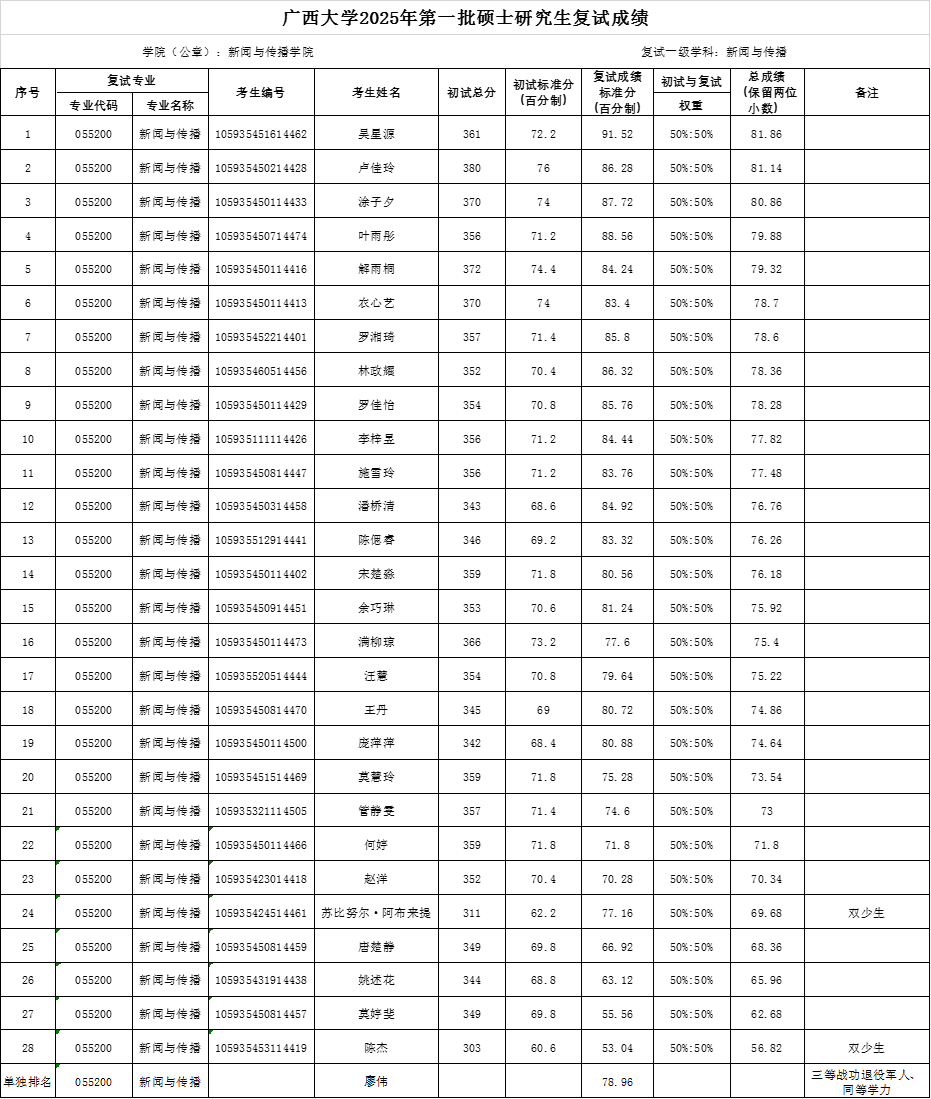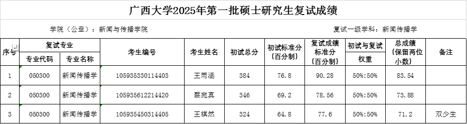tyc122cc太阳成集团2025年新闻传播学、新闻与传播一志愿考生复试成绩如下,如有异议,请联系tyc122cc太阳成集团研究生办公室反映,联系电话:0771-3229833。