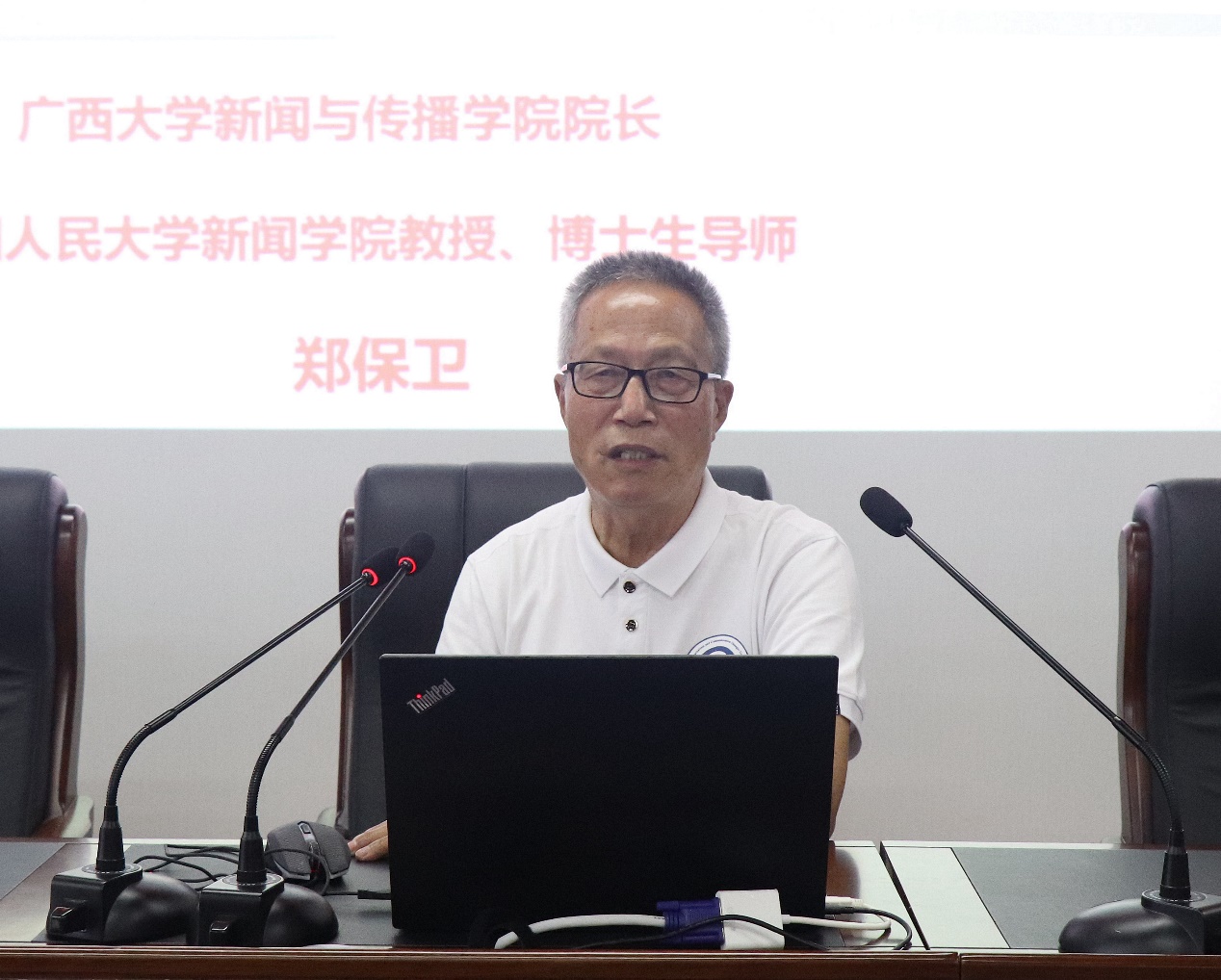 仪式结束后,郑保卫经理做了主题为“清凉山新闻讲坛——延安时期党的新闻工作与马克思主义新闻观中国化”的讲座。他系统讲述了马克思主义新闻观与延安的历史渊源,梳理了从红军结束长征到达延安到毛泽东党中央离开延安前往西柏坡的这段时间里,发生的新华社组建、《解放日报》创刊及改版、整顿文风、反“客里空”运动等诸多与中国共产党新闻事业息息相关的大事。他认为马克思主义新闻观对于当今新闻界的种种乱象仍是一剂良药,新闻工作者应努力做党的政策方针的宣传者、时代风云的记录者、社会进步的推动者、公平正义的维护者,并鼓励同学们多阅读诸如陆定一的《我们对于新闻学的基本观点》等名篇。